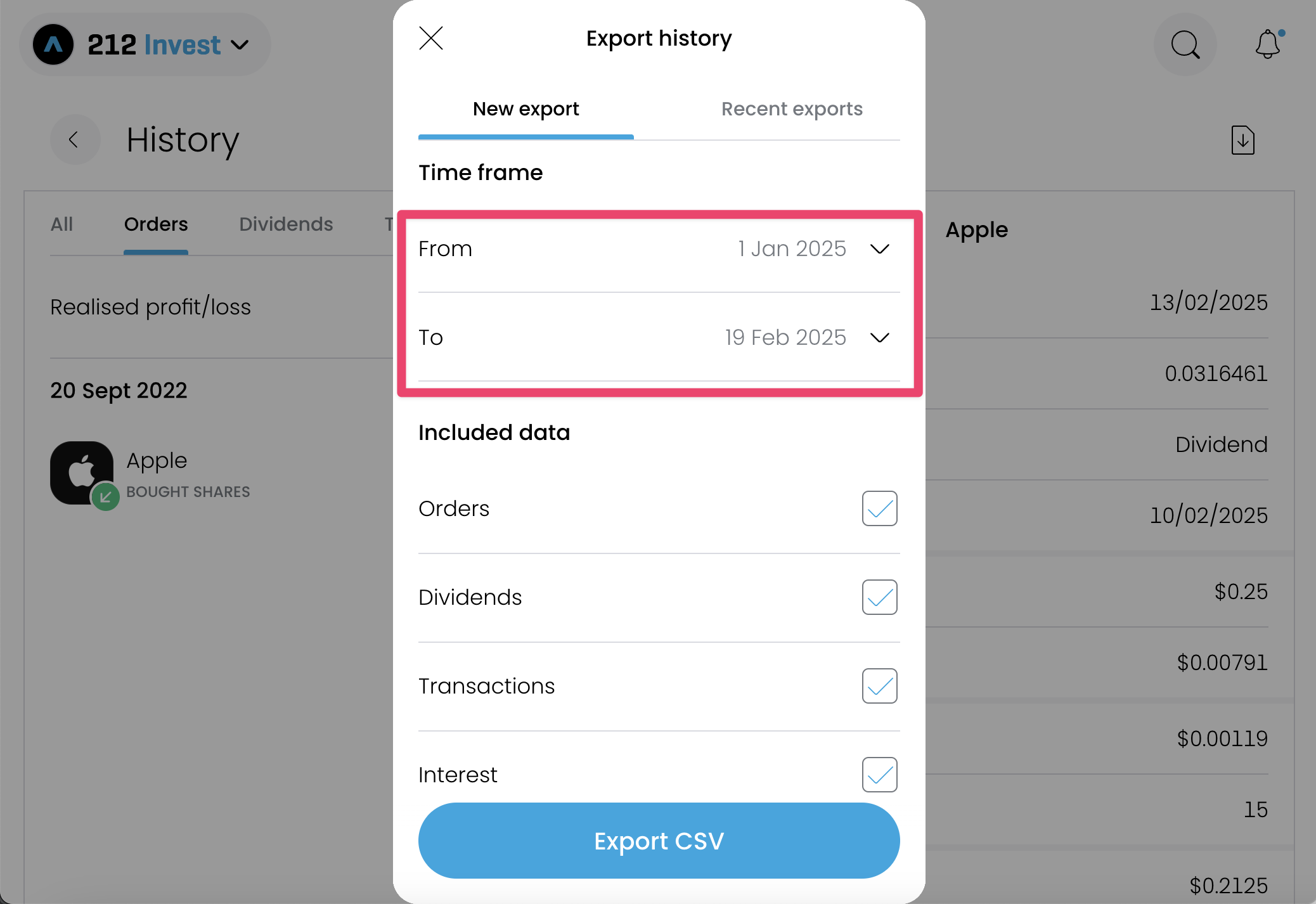 - Select a time frame from the beginning of the portfolio. Trading 212 allows you to export at most 365 days at a time, so if your portfolio is older than 1 year, export it year by year. We recommend exporting it by calendar years to make sure you export all transactions.